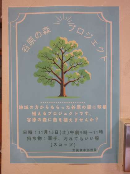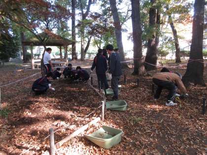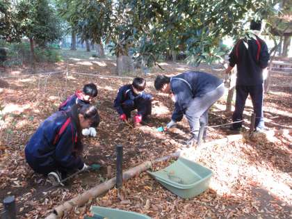 しました。来春の開花を願ってチューリップやクロッカス、ムスカリの 球根を植えました。 遡ること二週間前、15日の作業が順調に進むよう、父親の会やPTA役員 の皆さんはじめ青少年育成谷原地区委員会や地域の方が、堅く踏みしめ られた森の土を耕してくださっていました。 落ち葉を土に戻すことは森の再生にもつながります。谷原の森は、自然 の循環を学ぶ生きた教材にもなっています。