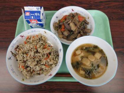 【本日の献立】 「ひじきご飯」「鶏と野菜の煮物」「お麩とわかめの味噌汁」 「牛乳」 ☆今日、学校は小学生部活動体験でした。2回目の今回は、おとなり北 原小学校の児童が体験に来ました。2年生の部長やキャプテンを中心 に小学生を上手に誘導して作業や動きの基本を伝えました。当時のこ とを思い出しながら一生懸命リードしていました。先輩としての背中 を見せることができました。 11月17日(月)