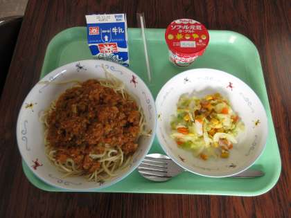 【本日の献立】 「スパゲティミートソース」「キャベツとコーンのソテー」 「元気ヨーグルト」「牛乳」 ☆昨日は、日本付近を通過する二つ玉低気圧の影響で時折小雨の降るあ いにくの天気でした。低気圧に向かって冷たい空気が流れ込み、下水 口から湯気が立ち上るほど、気温もずいぶん低くなりました。カレン ダーを見てみると一ヶ月後はもう冬休みです。 11月25日(火)