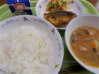 竜田揚げは、肉や魚にしょうゆで下味をつけて片栗粉をまぶして油で揚げた日本発祥の料理です。から揚げと似ていますが、竜田揚げはしょうゆ・みりんをベースに味付けし、薄力粉ではなく片栗粉をまぶすのが特徴だそうです。片栗粉だけをまぶすのでから揚げと比べて衣の色が白っぽくサクサクした食感になります。 今日の豚汁にはれんこん、大根、にんじん、かぶ、ねぎと冬が旬の野菜をたくさん使っています。旬の野菜は旬の時期が一番おいしく栄養があります。ぜひしっかり食べて風邪を予防しましょう。 12月9日(火)の献立