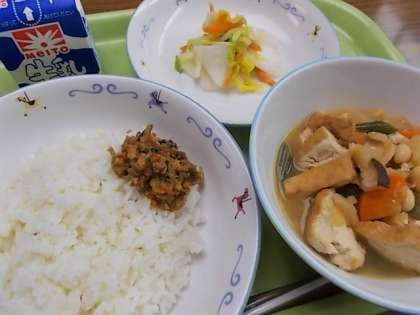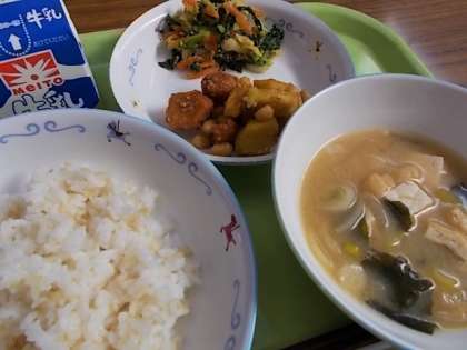 きなこ豆の「豆」は大豆です。大豆は中国が原産で、昔から五穀のひとつとして栽培されてきました。日本には縄文時代後期から弥生時代初期に伝わったそうです。 大豆はタンパク質が豊富で、必須アミノ酸がバランス良くふくまれています。またその組み合わせが動物性タンパク質によく似ていることから「畑の肉」ともよばれています。今日は大豆の周りについている「きなこ」も大豆から作られたものです。大豆の栄養をしっかりとることができますね。 10月24日(金)の献立
