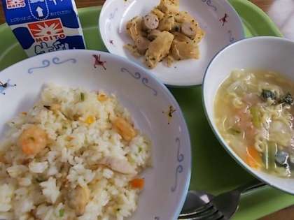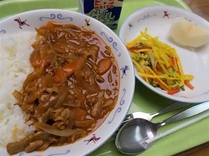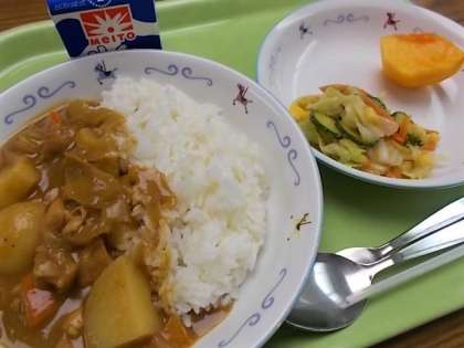 タンドリーチキンはインドの鶏肉料理です。ヨーグルト、塩こしょう、カレー粉などの香辛料に鶏肉をつけこんでオーブンで焼いて作ります。今日はタンドリーチキン味にした鶏肉を一度オーブンで焼いてからカレーの中に入れています。牛乳も入っていて、いつもと少し違ったカレーになっています。 今日の果物は秋が旬の柿です。柿にはみかんの約2倍のビタミンCがふくまれます。ビタミンCは免疫力を高めてくれるので、風邪の予防効果が期待できます。 10月15日(水)の献立