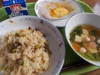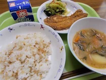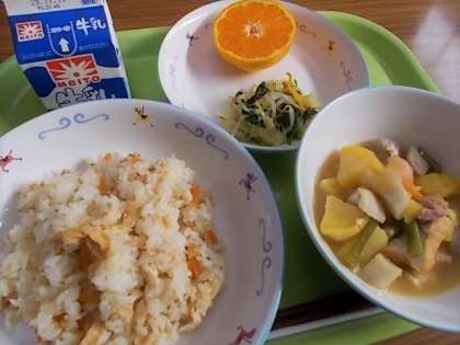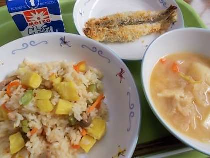 さざれ焼きの『さざれ』とは、小さいや細かいという意味があります。魚や肉に細かいパン粉をつけて焼くことから、さざれ焼きという名前がつきました。給食ではししゃもにマヨネーズをからめ、生パン粉と乾燥パン粉を合わせたものをまぶしてオーブンで焼いています。 秋の香りごはんにはさつまいもやしめじ、しいたけなど秋が旬の食材をたくさん入れています。 10月29日(水)の献立