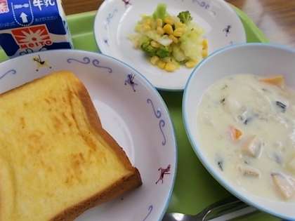 今日は世界の料理、カナダです。 カナダは世界中の様々な国からの移民を受け入れているので、イギリスやフランスなどいろいろな国の料理に影響を受けています。 メープルシロップはカナダの名産品で、世界一の生産国です。サトウカエデなどの樹液でできた甘味料で、独特な風味があります。また、鮭の消費量が非常に多く、輸出量も世界最大です。今日はメープルシロップを使ったメープルフレンチトーストと、鮭を使ったサーモンチャウダーにしました。 10月22日(水)の献立