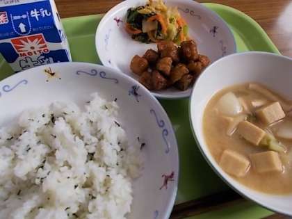 今日は秋が旬のかつおを使った献立です。かつおは春と秋の2回旬があります。秋に出回るかつおは「戻りがつお」と呼ばれ、脂ののりがいいのが特徴です。ビタミンB群が多くふくまれ、からだの機能を正常にしてくれる働きがあります。 かつおには特有のくさみがありますが、今日のようにしょうがと合わせたり一度揚げたりすることでくさみをとることができます。甘辛い味がごはんとも合いますよ。 10月27日(月)の献立