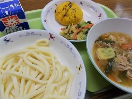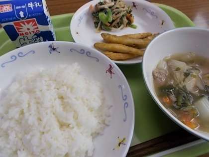 今日は月1回のラッキースター献立でした。レンコン入り鶏つくねの中に各クラス1枚星形の人参を入れています。 切り干し大根とは、大根の乾燥品のことです。秋の終わりから冬にかけて収穫した大根を細切りにし、広げて天日干しします。太陽の光を浴びることで糖化されて甘味が増し、栄養価も増します。同量の大根と比べると、骨や歯を丈夫にするカルシウムは15倍、貧血を予防する鉄分は32倍、代謝を促進するビタミンB1・B2は10倍にもなります。 10月23日(木)の献立