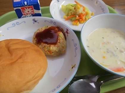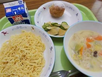 タンメンは塩味のスープに炒めた野菜がたくさん入った麺料理です。東京ではよく知られていますが、実は関東以外の地域ではあまり食べられていません。元々は中国の家庭料理を再現しようと日本の料理人が作ったもので、中国では骨や肉を煮詰めて作るスープのことを「湯(タン)」と呼ぶのでタンメンという名前になったそうです。 小松菜白玉ドーナッツは薄力粉の他に白玉粉も入れて作りました。もちもちした食感です。 11月5日(水)の献立