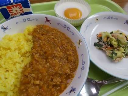 おかしな目玉焼きは見た目が目玉焼きのように見える給食では定番のデザートです。小学校でも出ていたという人も多いのではないでしょうか。今では東京都のいろいろな学校で出されていますが、その発祥は練馬区だといわれています。 黄身の部分は黄桃、白身の部分は牛乳寒天で作っています。白身の部分をカルピスに変えると『おかしな半熟卵』、りんごジュースに変えると『おかしな生卵』、黄桃をあんずに変えると小さなサイズの黄身とアレンジすることができます。 11月7日(金)の献立