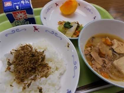 今日の果物は柿です。柿は日本で昔から食べられている果物で、奈良時代ごろから食べられているといわれています。その品種は200種類近くあり、富有柿や次郎柿が有名です。9月〜12月が出回り時期で、育てやすい果物のため、庭に柿の木がある家をよく見かけるのではないでしょうか。 柿はビタミンCやカロテンを多くふくみます。特にビタミンCは、柿を1つ食べるだけで人が一日に必要とするビタミンCをまかなえるほどです。 11月12日(水)の献立