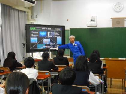 本日の講話は、4つのテーマに分かれ、班ごとに聞きたいテーマに分かれます。 以下の画像は (1)潜水調査船、海洋研究(深海生物、プレートなど)について 国立研究開発法人海洋研究開発機構(JAMSTEC) 有人潜水調査船しんかい6500初代パイロット (2)航海士の仕事、帆船について 独立行政法人海技教育機構 航海士 です。