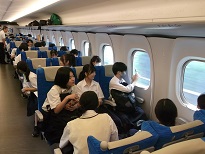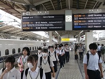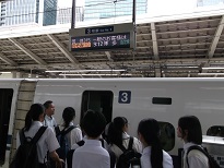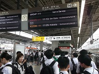 出発式も終わり、諸連絡後に新幹線ホームへ移動します。本日は休日ですので東京駅の混雑は平日ほどではないと思いますが、多くの人が出ています。新幹線は予定通り出発し一路京都に向かいます。京都での本日の予定は、レンタルの和服に着替えタクシー行動で京都市内の見学・学習となります。