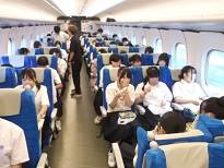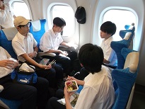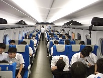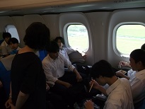 行きの新幹線車内の様子です。座席の近い人たちでゲームをしたり、朝が早かったのでひと眠りなどリラックスして過ごしました。