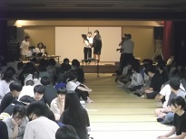 百人一首大会が始まりました。読み手は先生方が分担し大会を盛り上げました。