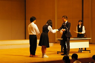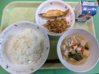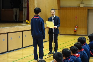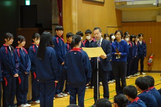 ・鮭のもみじ焼き ・じゃがいものきんぴら ・豆腐のみそ汁 ・牛乳 昨日、11月24日は「いい日本食」の語呂合わせから「和食の日」とされています。世界からも注目されている「和食」を改めて見直し、大切にしていきたいですね。 さて、日本料理では、赤く仕上げた料理に「もみじ焼き」という名前を使います。料理の赤色が、秋に色づくもみじを連想させることから、その名が付きました。今日の給食では、にんじんで赤く仕上げた「鮭のもみじ焼き」です。 11月10日(月) 全校朝礼、表彰