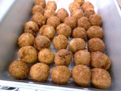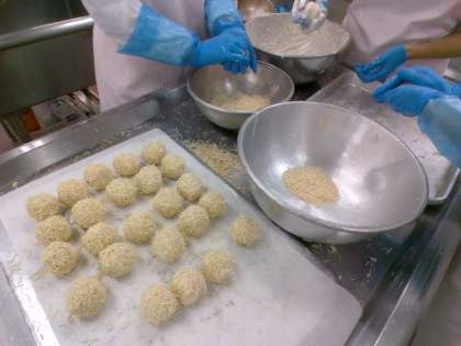 ・青菜のごまあえ ・いが栗坊や ・牛乳 栗の木には実っている栗は「鬼皮」という固い皮と、「いが」に包まれています。今日は、いがに包まれたいが「いが栗」に見立てた「いが栗坊や」という料理を作りました。栗とさつまいもで作ったあんを丸め、細かく折ったそうめんをまぶして揚げました。秋の味覚を味わいました。 11月25日(火)給食の紹介