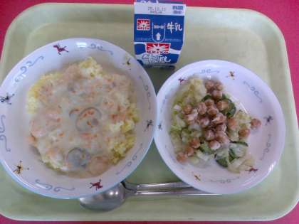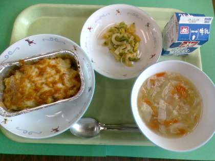・にんじんドレッシングサラダ ・ABCパスタスープ ・牛乳 ドリアは、ピラフの上にベシャメルソースをとチーズをかけて、焼いた料理です。横浜のホテルの料理長が作ったのが発祥と言われています。今では、日本の洋食屋さんの定番料理ですね。給食室では、ピラフもベシャメルソースも一からすべて手作りです。調理員さんが朝から心を込めて作ってくれました。 11月26日(水)給食の紹介