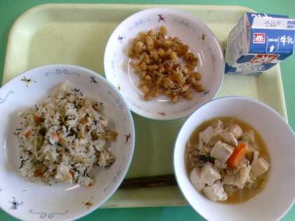 ・豆じゃこ ・肉豆腐 ・牛乳 豆じゃこはカリッと揚げた大豆と炒ったじゃこを甘辛いたれにからめた料理です。大豆は「畑の肉」と呼ばれ、畑でとれる食べ物ですが、良質なたんぱく質を含み、お肉のような栄養があります。また、食物繊維も多く、おなかの掃除をする働きもあります。大豆や大豆製品は、栄養満点で給食によく登場します。ご家庭でも、積極的に食事に取り入れてみましょう。 11月27日(木)給食の紹介