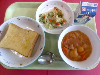 ・チキントマトシチュー ・フレンチサラダ ・牛乳 寒くなってきたためか、牛乳の残食が多くなっています。中学生の1日に必要なカルシウムの量は女子800mg、男子1000mgです。成長期には特に多くのカルシウムが必要になります。給食に毎日出る牛乳は、1本飲むと227mgのカルシウムを補給できます。貴重なカルシウム源ですので、生徒のみなさんにはしっかり飲んでもらいたいです。アレルギーや体調により飲めない場合には、大豆や大豆製品、小魚、海藻、青菜など積極的に食べてカルシウムを補うようにしましょう。 11月28日(金)給食の紹介