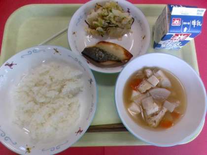 ・さばの西京焼き ・キャベツの昆布あえ ・けんちん汁 ・牛乳 西京焼きは、京都の白みそ「西京みそ」に漬け込んで焼く料理です。西京みそは、京都で誕生したみそで、色の美しさと甘みのあるみそです。今日は、さばの西京焼きを作りました。みそに漬け込むことで、魚の臭みが消えて食べやすくなります。 12月4日(木)給食の紹介