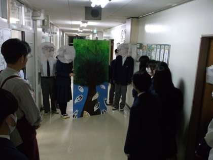 美術部が作成した周年記念作品を学校側へ贈呈しているシーンです。作品名は「大樹」です。関中学校のシンボルであるケヤキと校章をモチーフにして素敵な作品となりました。